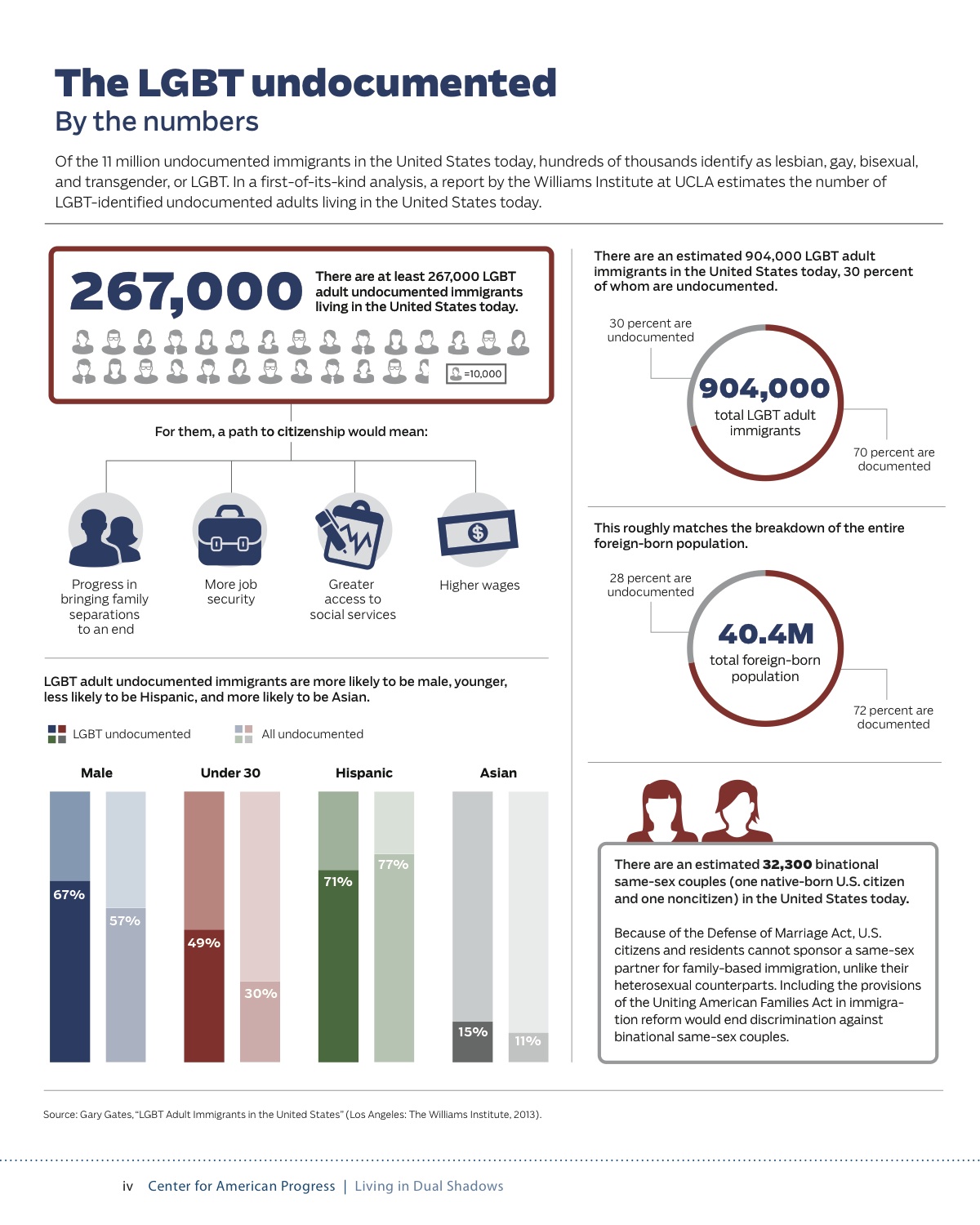 The report estimates that there are at least 267,000 lesbian, gay, bisexual, and transgender undocumented immigrants residing in the U.S., and an estimated 32,300 binational same-sex couples who are denied immigration status protections and benefits because of the misnamed Defense of Marriage Act (currently being challenged in the U.S. Supreme Court).